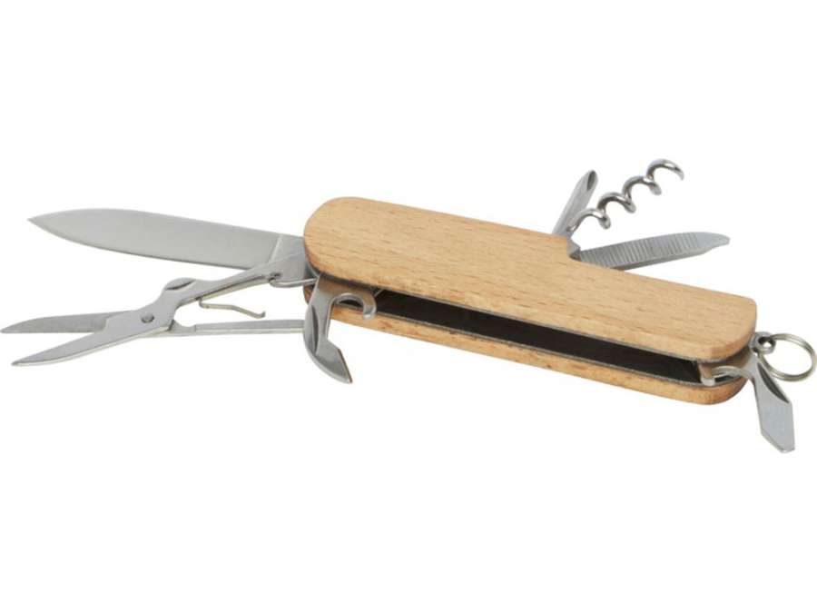 Прочный и долговечный компактный карманный нож из высококачественной нержавеющей стали с рукоятками из буковой древесины. Этот карманный нож должен быть у любого скаута, мастера и любителя отдыха на природе. Имеет 7 функций: нож, штопор, напильник/очиститель напильника, кольцо для ключей, плоская отвертка, открывалка для бутылок/банок и ножницы. Используемая буковая древесина поступает от надежных поставщиков, соблюдающих все экологические и социальные нормы. Размер в открытом состоянии 17 x 2, 5 см, а в закрытом — 9, 5 x 2, 5 см. Поставляется с инструкцией по эксплуатации и упакован в подарочную коробку из переработанного картона размером 12 x 4, 5 x 2 см.