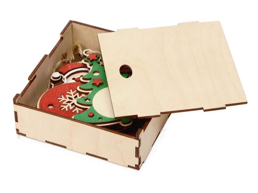 Набор из пяти новогодних подвесок упакован в коробку-футляр из березовой фанеры. Брендировать можно как сами игрушки, так и упаковку, причем помимо традиционной для фанеры гравировки предусмотрена возможность использования и других методов нанесения. Подвески будут напоминать о вашем бренде каждое рождество, создавая праздничное настроение, а футляр в дальнейшем может использоваться в качестве шкатулки для мелочей или для рукоделия.