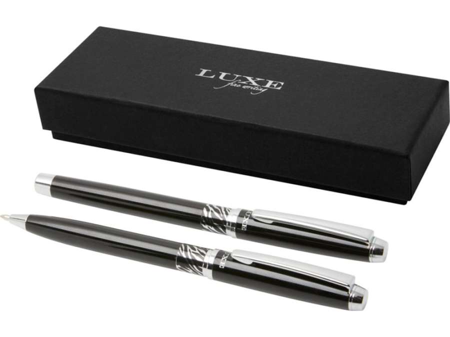 Шариковая ручка и ручка-роллер с декоративным узором на корпусе. Шариковая ручка предварительно заполнена синими чернилами, а ручка-роллер предварительно заполнена черными чернилами. Упакована в подарочную коробку LUXE. Латунь. Комплектность: шариковая ручка, ручка - роллер