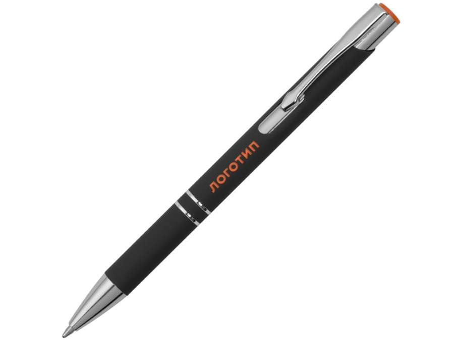 Черная шариковая ручка с кнопочным механизмом и тактильно приятным покрытием софт-тач. Цветная гравировка соответствует цвету кнопки и делает ее еще более изысканным подарком.