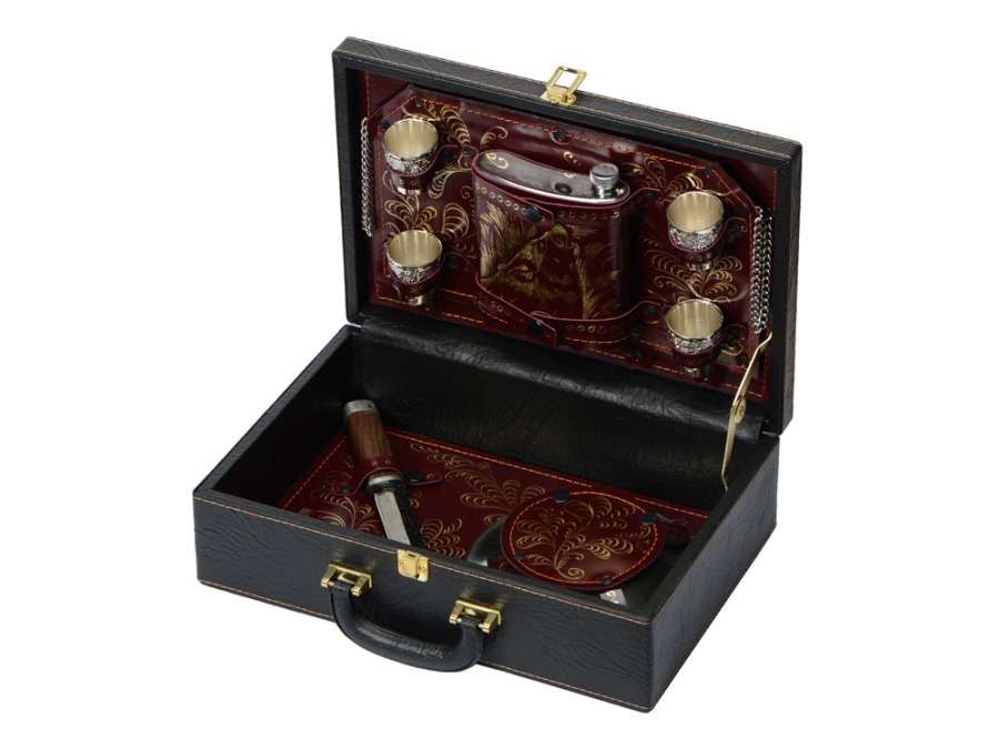 Тарелка из нейзильбера– 4 шт. Комплектность: тарелка d18, 3 х 2, 5 см - 4шт, нож 23, 5 х 3 х 2, 3 см, зажигалка 3, 3 х 6, 7 х 1, 2 см, стопка d4, 3 х 4, 9 см - 4шт, фляга 12, 7 х 16 х 4 см