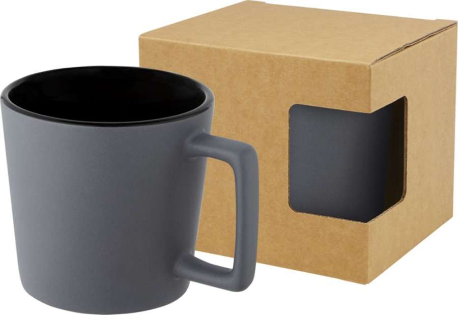 Керамическая кружка с современным дизайном и матовой отделкой. Объем 370 мл. Можно мыть в посудомоечной машине. Поставляется в упаковочной коробке из переработанного картона. Керамика.