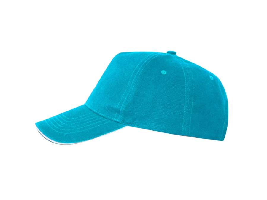 Бейсболка из 5 панелей с контрастным сэндвичем. Четыре вышитых вентиляционных люверса. Застежка на липучку.