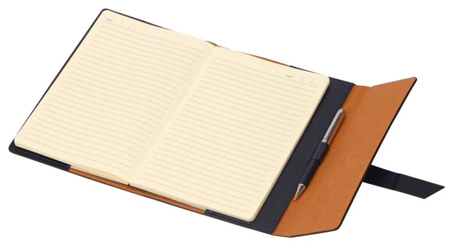 Бизнес-блокнот формата А5 в твердой обложке из искусственной кожи с ручкой в тон станет отличным подарком для любого клиента. Блокнот состоит из обложки с клапаном и сменного блока с линованными страницами.