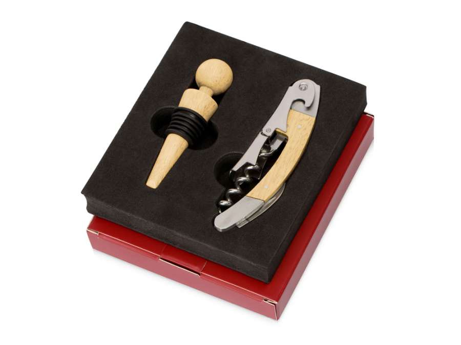 Детали выполнены из разных пород дерева, что объясняет возможное различие оттенков изделия в наборе, естественное для натурального материала. Комплектность: пробка для вина, штопор