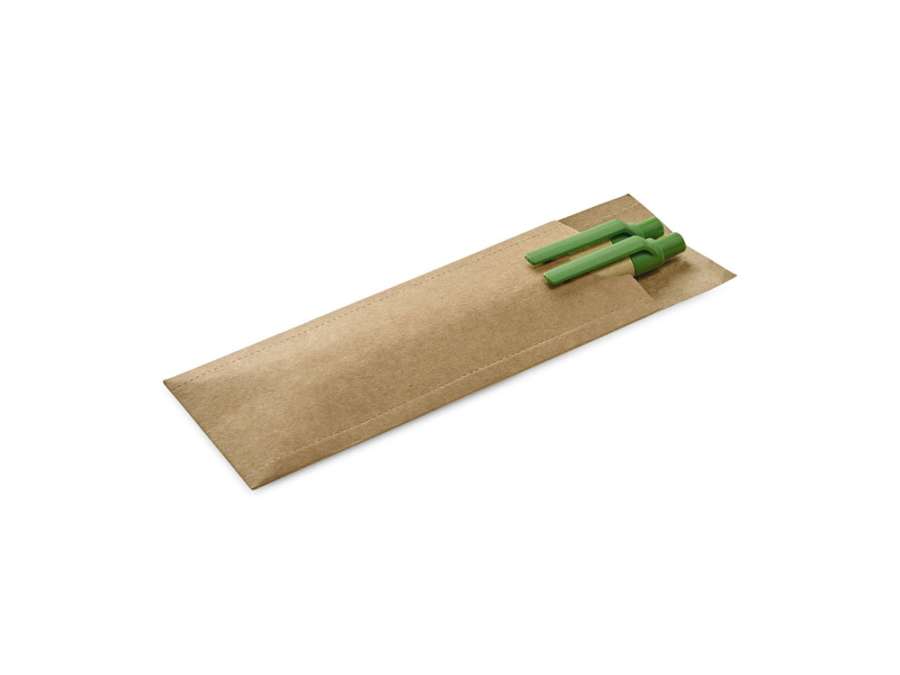 Набор из шариковой ручки и механического карандаша из крафт-бумаги. Оба с зажимом. Шариковая ручка с синими чернилами, а механический карандаш с графитом 0, 5 мм. Поставляется в картонном чехле. ø10 x 138 мм | сумка: 175 x 55 мм. Вид нанесения, рекомендуемый поставщиком: тампопечать, УФ-печать. Комплектность: шариковая ручка, механический карандаш
