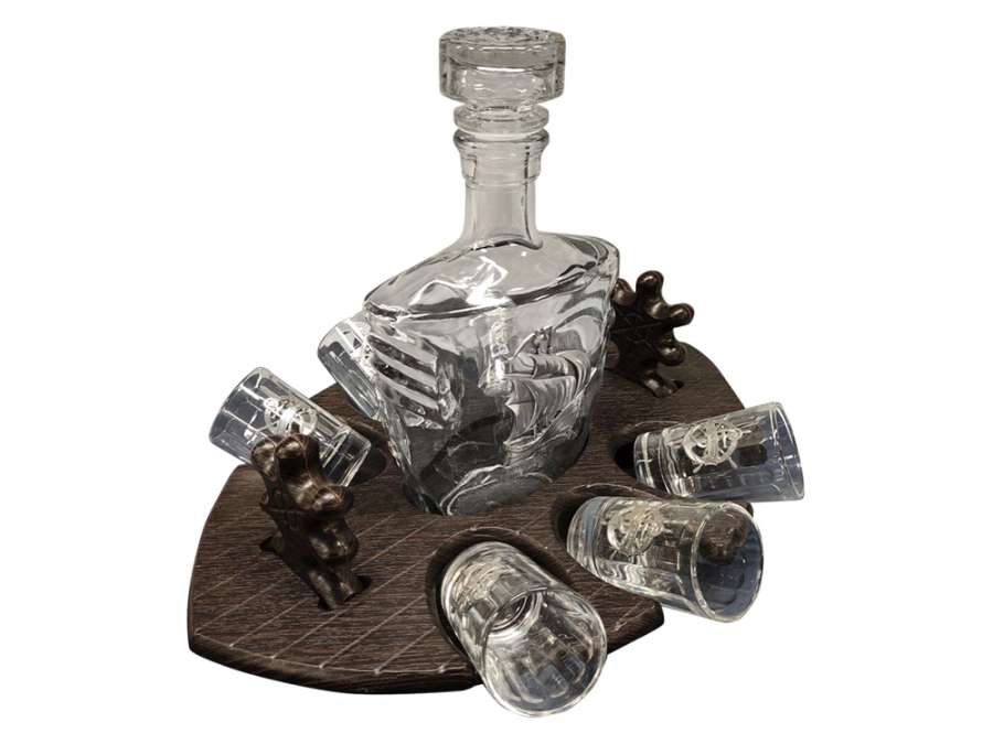 Набор для водки со штофом. В набор входит штоф 0. 5 л с оловянным барельефом, шесть стопок 60 мл с оловянным барельефом и подставка мини-бар в форме корабля.