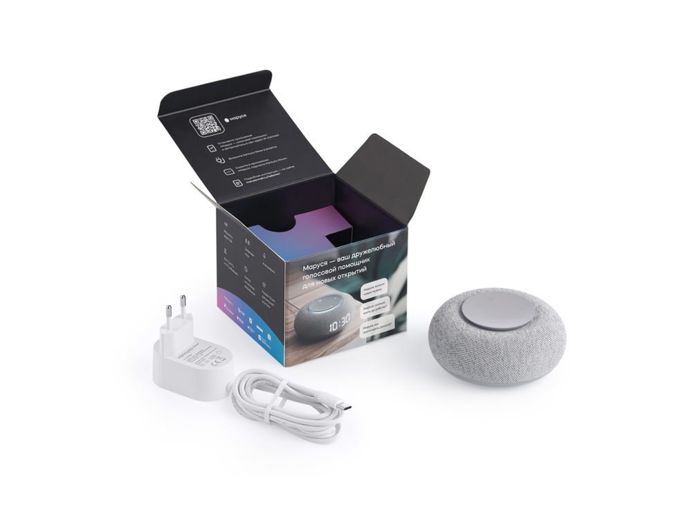 Маруся может поздравить своего обладателя приветствием (разово или при каждой новой привязке к смартфону). Приветствие доступно для тиражей от 50 штук. Предложение по персонализации приветствия входит в цену. Срок установки голосовой персонализации до 5 дней после сборки заказа. Установка происходит удаленно (колонка скачает обновление при включении). Комплектность: инструкция, зарядный кабель