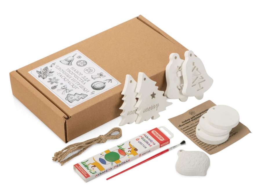 Мы подготовили готовый творческий набор, состоящий из игрушек, выполненных их гипса, кисти и акварельных красок.