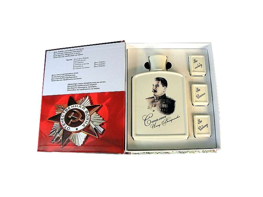 Подарочный набор стилизован под книгу и состоит из штофа с изображением генералиссимуса И. В. Сталина и трех рюмок с патриотическими тостами За Россию, За Родину”, За победу”. Все сувениры выполнены из высококачественной керамики, поэтому они еще долго будут служить и радовать глаз. Этот подарочный набор станет прекрасным дополнением к праздничному столу.