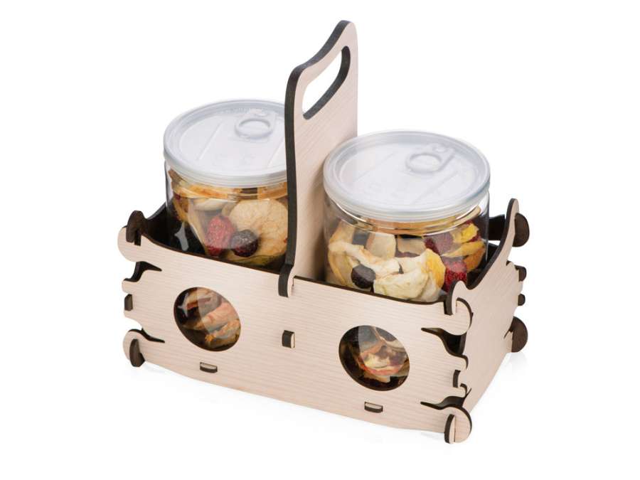 Мы красиво упаковали этот набор в корзинку-переноску из переработанной древесины, которую можно брендировать несколькими методами, и которая станет полезным, красивым и долговечным аксессуаром в доме. Чипсы упакованы в брендируемые наклейками пластиковые банки, которые можно использовать для хранения любых пищевых и непищевых предметов благодаря удобной форме и наличию плотно закрывающейся полиэтиленовой крышки. Комплектность: банка с сухофруктами (d8, 8 х 11, 9 см)- 2шт, подставка