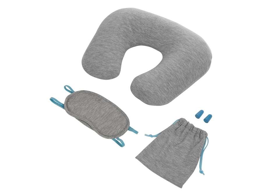 Контрастные детали голубого цвета добавляют набору стиля и неповторимости, при этом на универсальном сером будет выигрышно смотреться любой логотип или корпоративный слоган. Комплектность: мешочек 12, 5 х 15, 3 х 0, 4 см, маска для глаз 18 х 9 х 0, 6 см, подушка в надутом виде 31 х 23 х 10 см