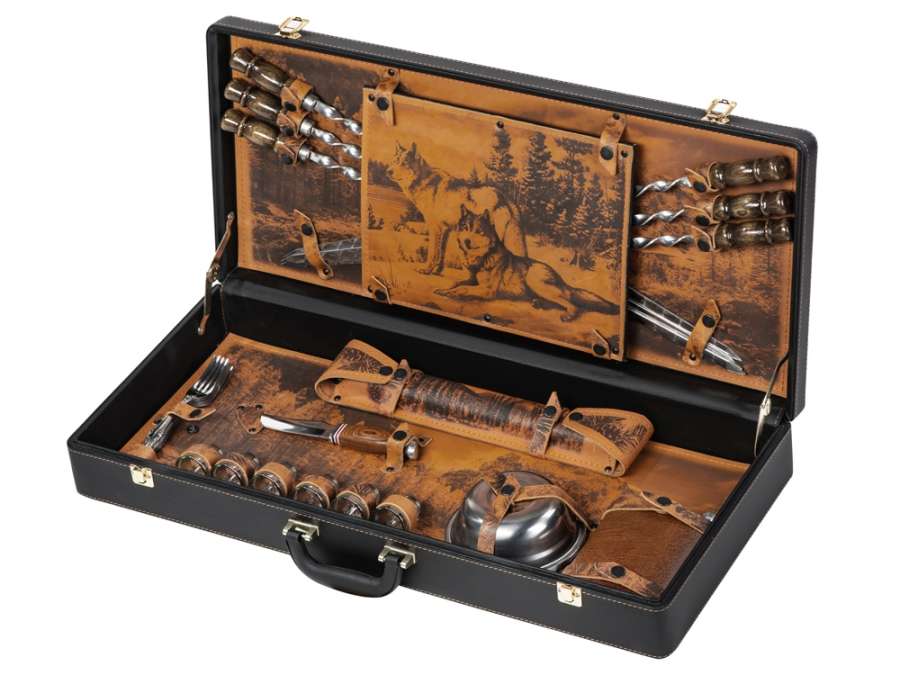 - мангал 24, 5 х 34, 7 х 16, 7 см Комплектность: шампура большие- 6 шт, доска разделочная, вилка- 6 шт, нож, стопка- 6 шт, тарелка- 6 шт, фляга, шампура мленькие- 6 шт, мангал
