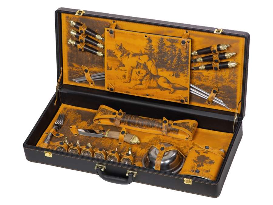 - мангал 24, 5 х 34, 7 х 16, 7 см Комплектность: шампура большие- 6 шт, доска разделочная, вилка- 6 шт, нож, стопка- 6 шт, тарелка- 6 шт, фляга, шампура мленькие- 6 шт, мангал
