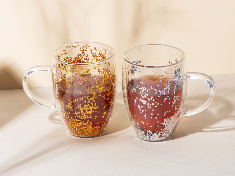 Кружка с праздничным настроением сделает любое чаепитие немного ярче и настроит на позитивный лад. Яркие блестки свободно перемещаются между двойными стенками: просто встряхните кружку, и вихрь цветных блесток взметнется наверх.