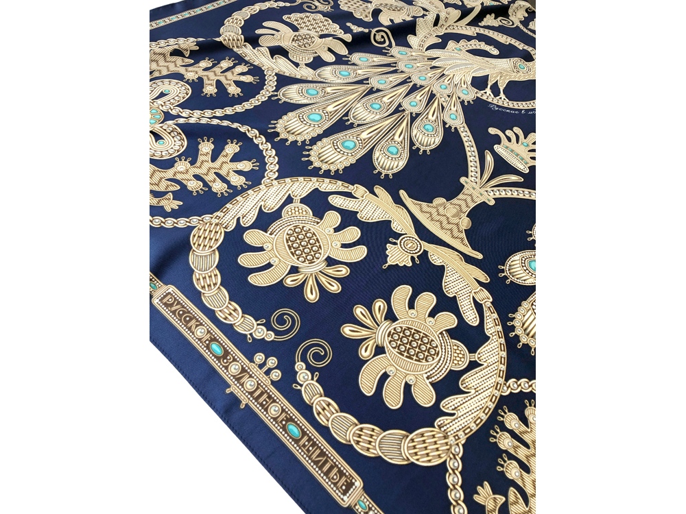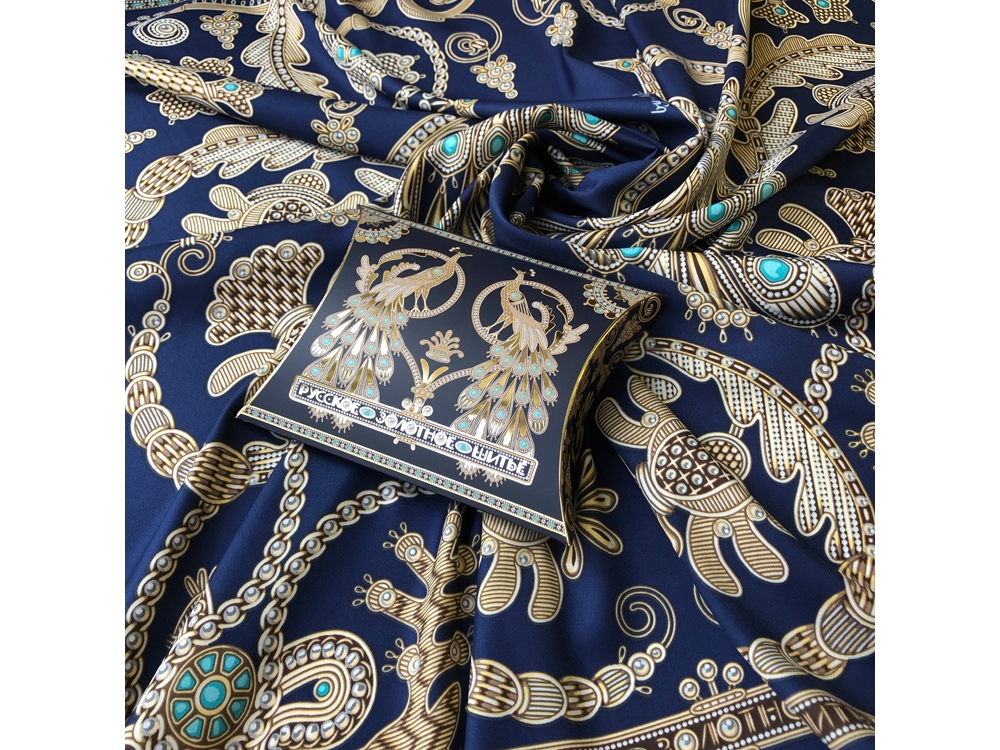 Платок Русское золотное шитьё посвящён драгоценному старинному русскому рукоделию. Дошедшие до нас памятники шитья, выполненные русскими мастерицами, являются произведениями высокой культуры. В изделиях сочетаются талант художника и тонкий вкус, духовное богатство, исполнительское мастерство вышивальщиц.