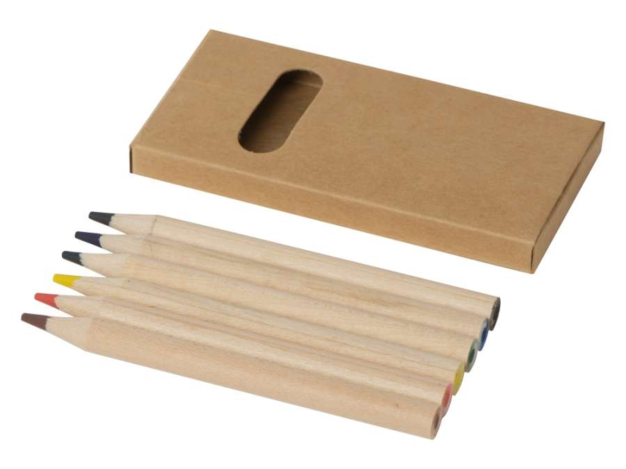 Набор из 6 цветных карандашей из натурального дерева. На картонную коробку и карандаши можно нанести логотип. Комплектность: цветной карандаш d0, 7 х 8, 8 см - 6 шт.