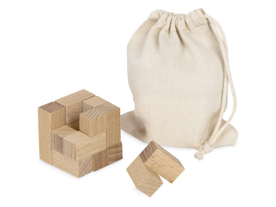 Состоит из семи деревянных деталей, поставляется в хлопковом мешочке на завязках. Кастомизация возможна, как на самих деталях, так и на мешочке. Комплектность: деталь головоломки - 7 шт.