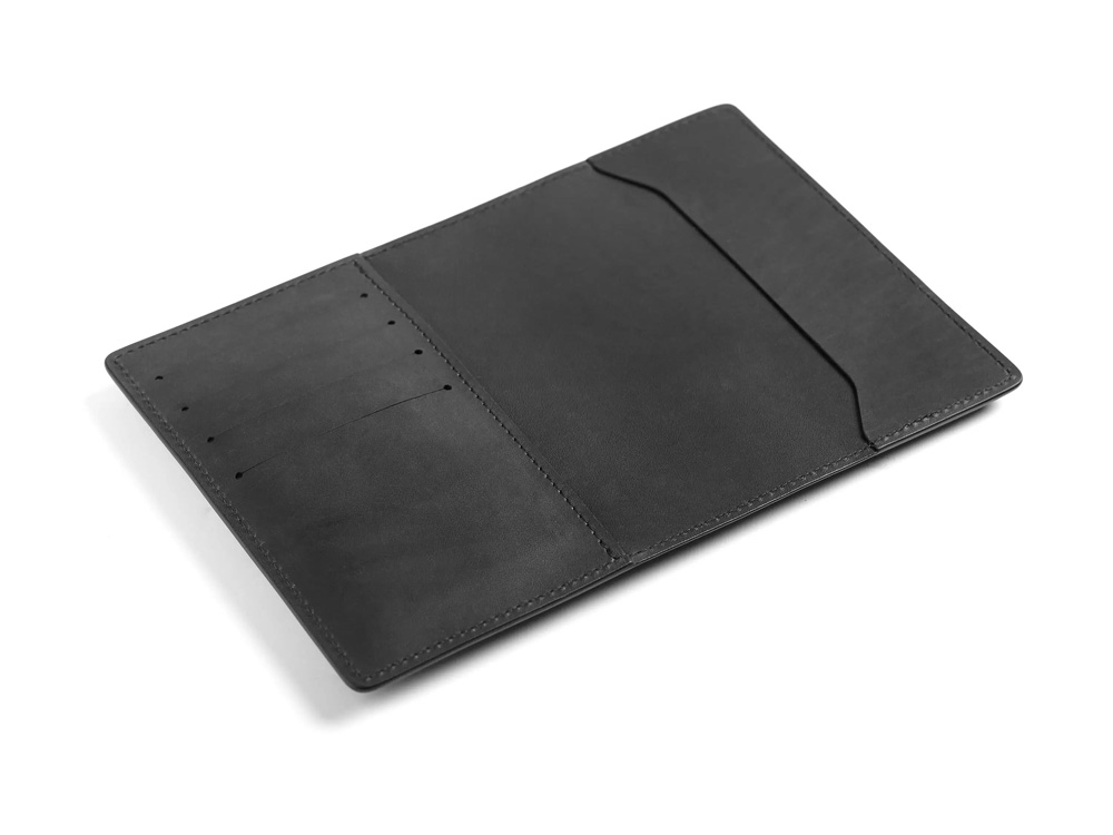 Классическая обложка из дублированной кожи, прокрашенные края, аккуратный шов, прорези для четырёх карт, место для паспорта и документов на машину.