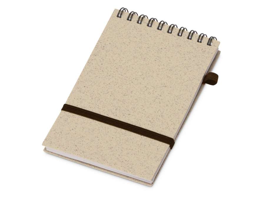 Блокнот с обложкой из переработанной пшеницы и пластика. Блок состоит из 60 листов переработанной бумаги белого цвета. Крепление - пружина. Дополнен петлей для ручки и горизонтальной резинкой.