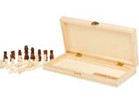 Наслаждайтесь интеллектуальной стимуляцией шахмат, куда бы вы ни пошли, с шахматным набором King. Набор включает 32 шахматных фигуры коричневого и цвета слоновой кости, искусно изготовленных из сосновой древесины, полученной из ответственных источников, что обеспечивает идеальное сочетание портативности и элегантности. Складной деревянный корпус обеспечивает удобное хранение и транспортировку. Прочные металлические петли и замок гарантируют, что шахматный набор всегда остается надежно закрытым и защищенным. Поставляется с коробкой из крафт-бумаги и инструкцией по эксплуатации. Комплектность: 32 шахматные фигуры