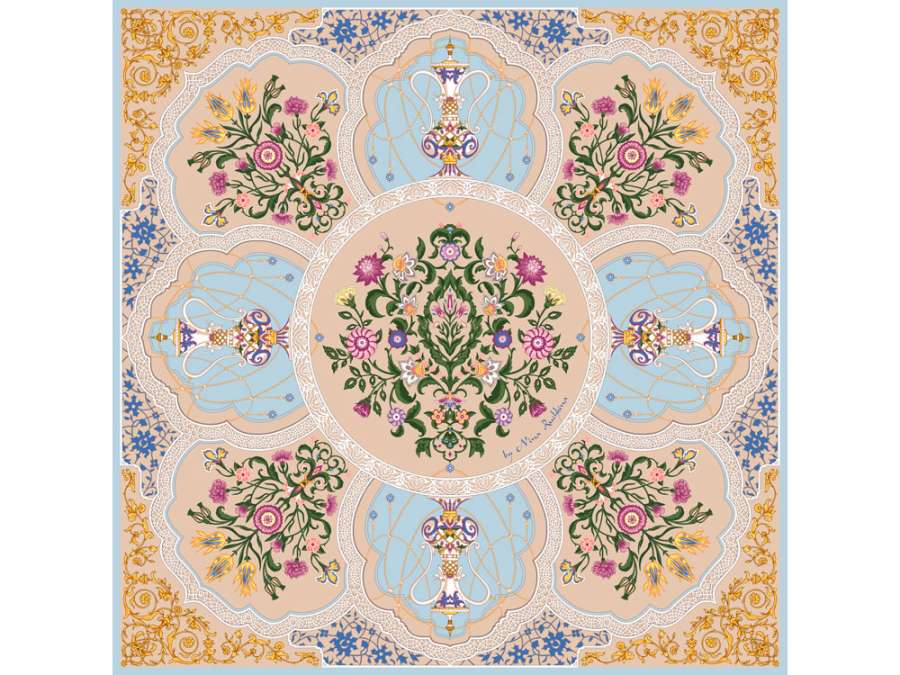 Платок Сады Востока от бренда Русские в моде” by Nina Ruchkina посвящен экзотической красоте, женской привлекательности и очарованию. В центре полотна расположились цветы дивного сада, олицетворяющие собой процветание, мир и земную любовь. Рядом изображены кувшины, наполненные росой молодости и секретами вечно цветущих восточных красавиц.