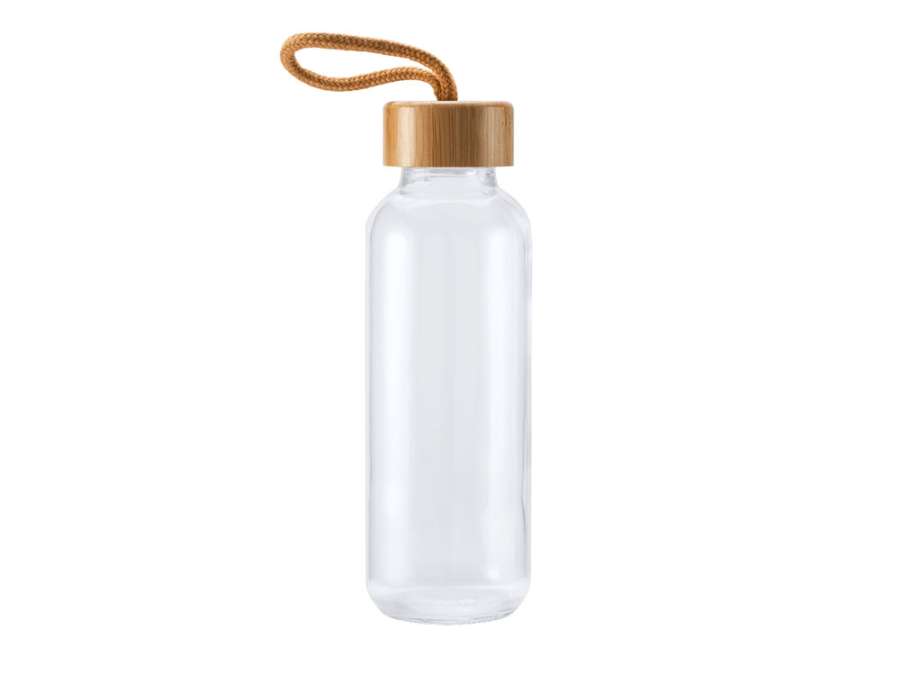 Стеклянная бутылка 450 мл с бамбуковой крышкой и ремешком для переноски с натуральной отделкой. Поставляется в дизайнерской коробке.