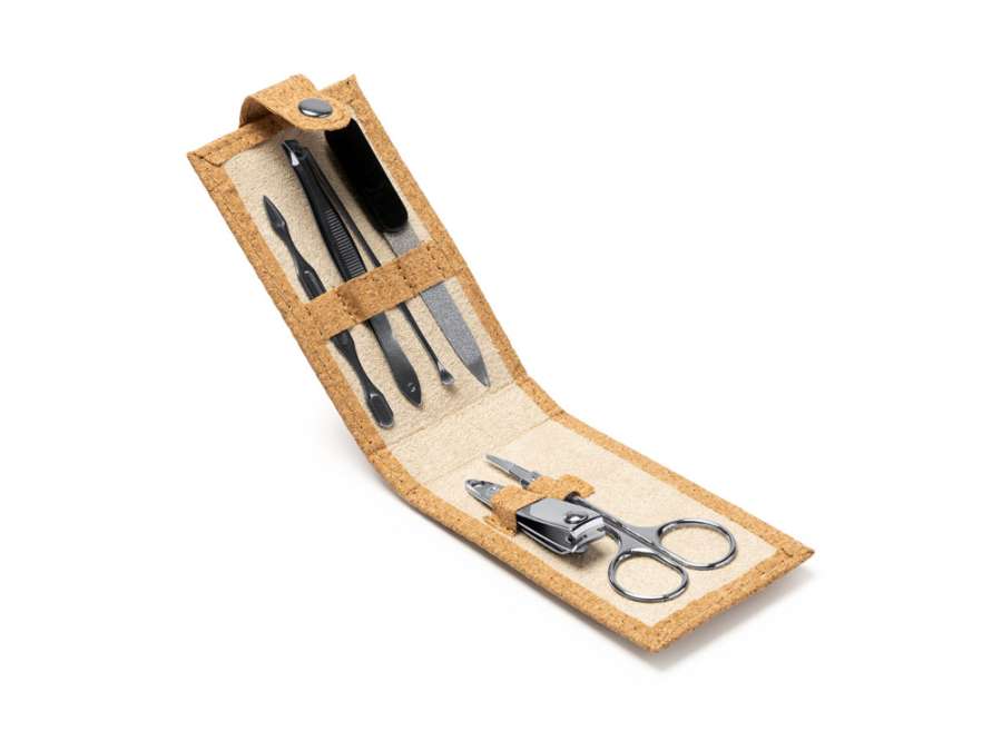 Маникюрный набор в чехле из пробки с застежкой на кнопу. Включает ножницы, пинцет, кусачки для ногтей, пилку и средство для удаления кутикулы из нержавеющей стали. Комплектность: ножницы, пинцет, кусачки для ногтей, пилка, средство для удаления кутикулы
