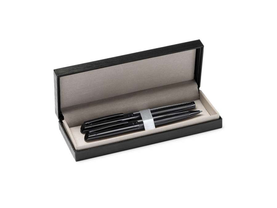 Элегантный набор, состоящий из ручки роллера и механического карандаша. Изготовлен из металла с затемненным рисунком. Поставляется в мягком футляре из кожзаменителя с внутренней подкладкой. Комплектность: ручка роллер, механический карандаш