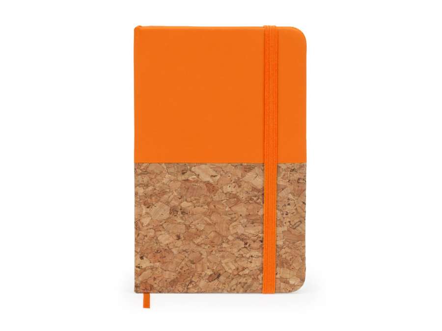 Блокнот формата А6. Комбинированная обложка из искусственной кожи и пробки. 80 нелинованных листов. Также у блокнота есть ляссе и резинка для фиксации.
