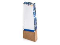 Награда выполнена из стекла, имеет необычную форму и расположена на деревянном постаменте. Лаконична и минималистична.