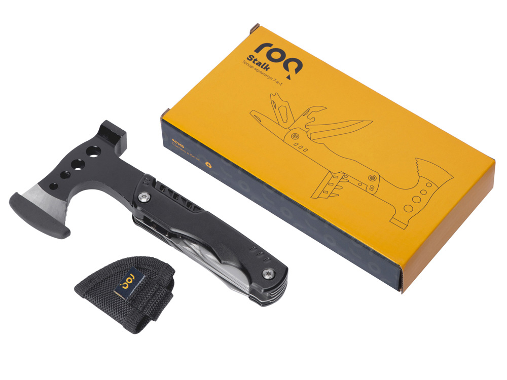 Топор-мультитул 7-в-1 Stalk бренда roq выполнен из нержавеющей стали 420 марки. Обладает значительным весом в 404 грамма для удобства работы топором или молотком. Товар поставляется в брендированном нейлоновом чехле с защитной накладкой на острие топора, что делает его транспортировку абсолютно безопасной.