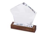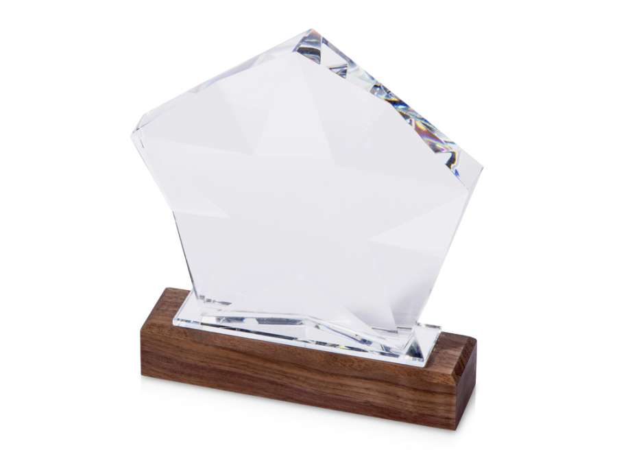 Награда выполнена из прозрачного стекла в виде звезды и расположена на деревянном постаменте. Благодаря выпуклым сторонам она интересно переливается в лучах света.