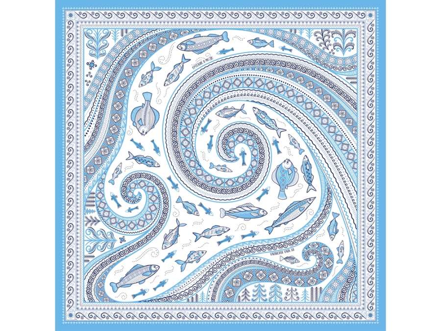 Платок из коллекции бренда Русские в моде посвящён уникальному искусству этой росписи. Изображения спиралевидных орнаментов в виде волн, елочек, рыбок украшают дизайн. Все это означает плодородие стихий земли и воды, энергию солнца, богатство и процветание.