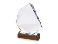 Награда выполнена из прозрачного стекла, имеет интересную асимметричную форму и расположена на деревянном постаменте.