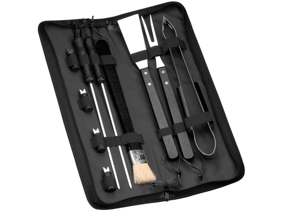Набор для барбекю Barabicu из 10 предметов. Чехол с застежкой на молнии, передним открытым карманом и двумя ручками, включая лопатку, вилку, щипцы, 2 шампура, кухонную кисть и 4 держателя для кукурузы. Комплектность: лопатка - 1 шт. , вилка - 1 шт. , щипцы - 1 шт. , шампура - 2 шт. , кухонная кисть - 1 шт. , держатели для кукурузы - 4 шт.