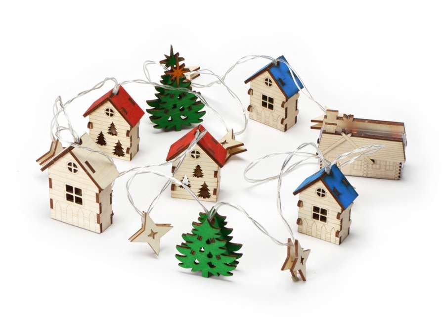 Светодиодная новогодняя елочная гирлянда постоянного свечения с цветными фигурками из натуральной березовой фанеры. Работает от 2-х батареек АА (в комплекте). Комплектность: домик- 5 шт. , елочка- 2 шт. , звездочка- 8шт. , лампочка (горит желтым цветом)- 15шт.