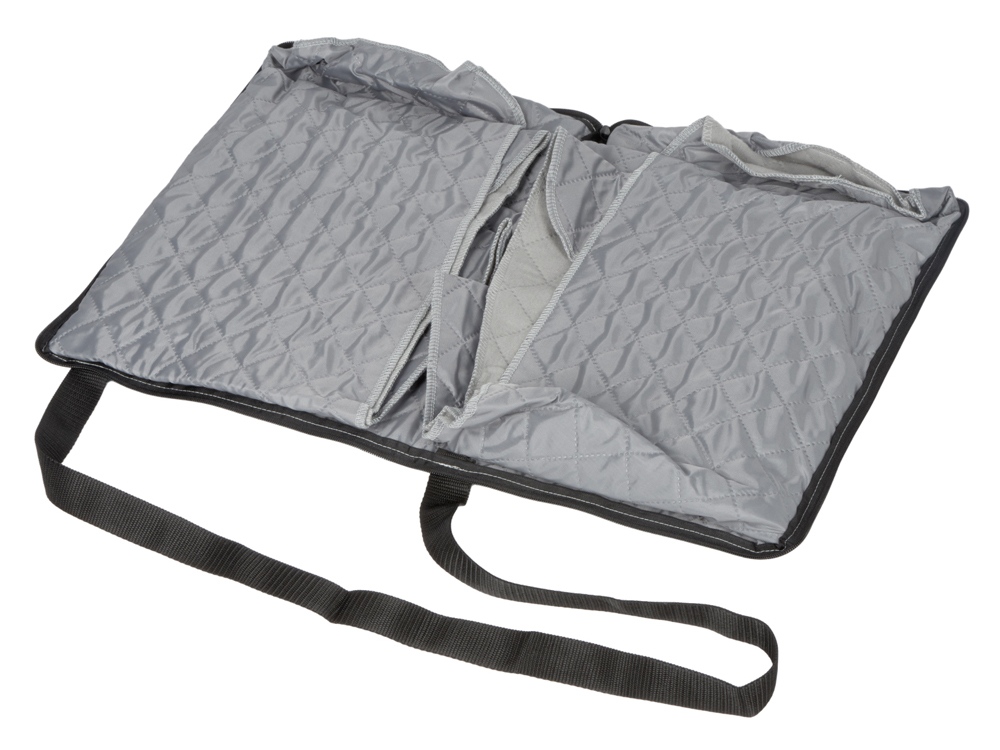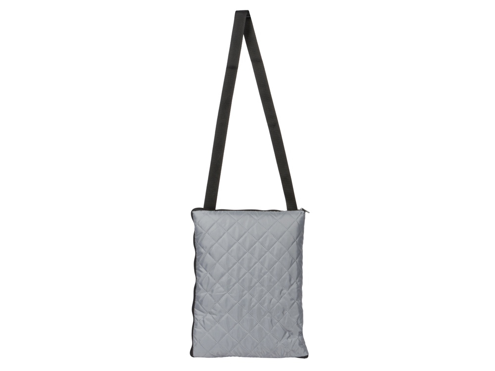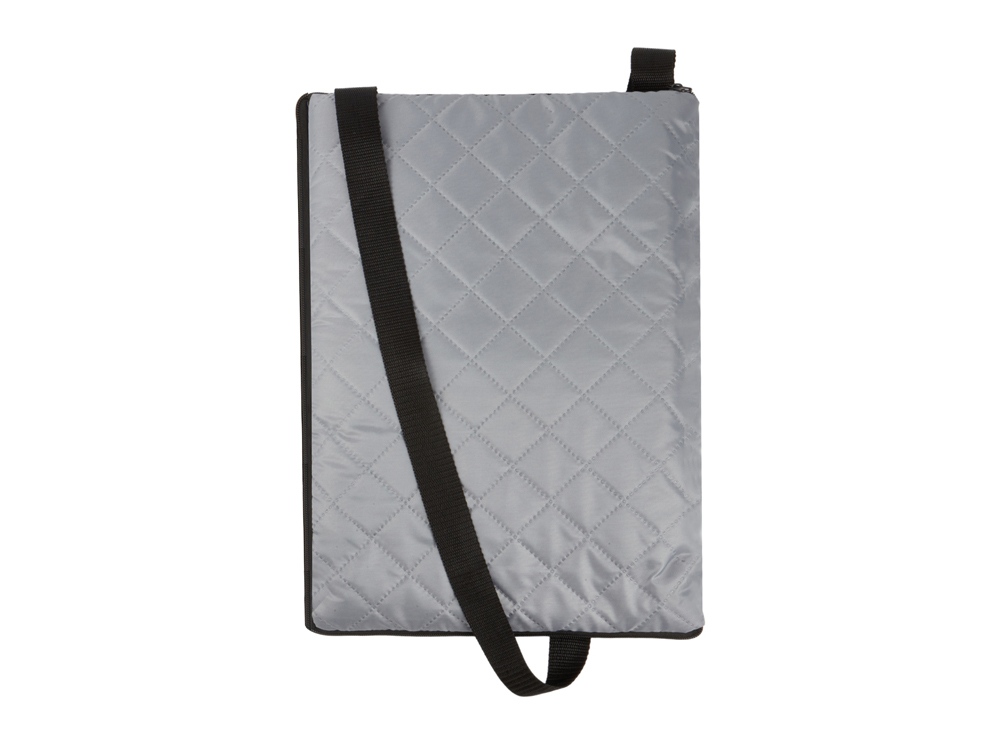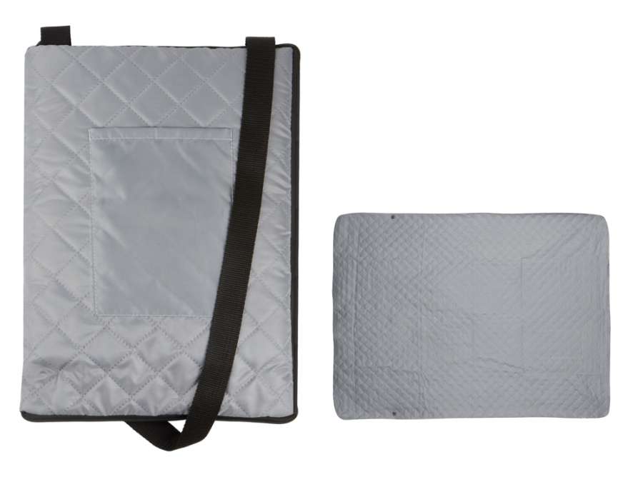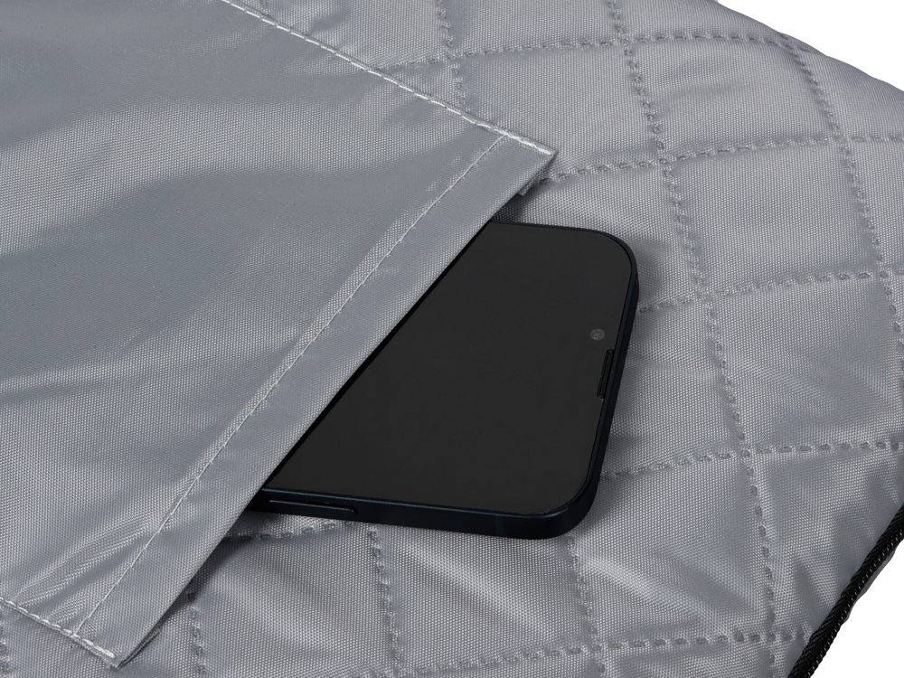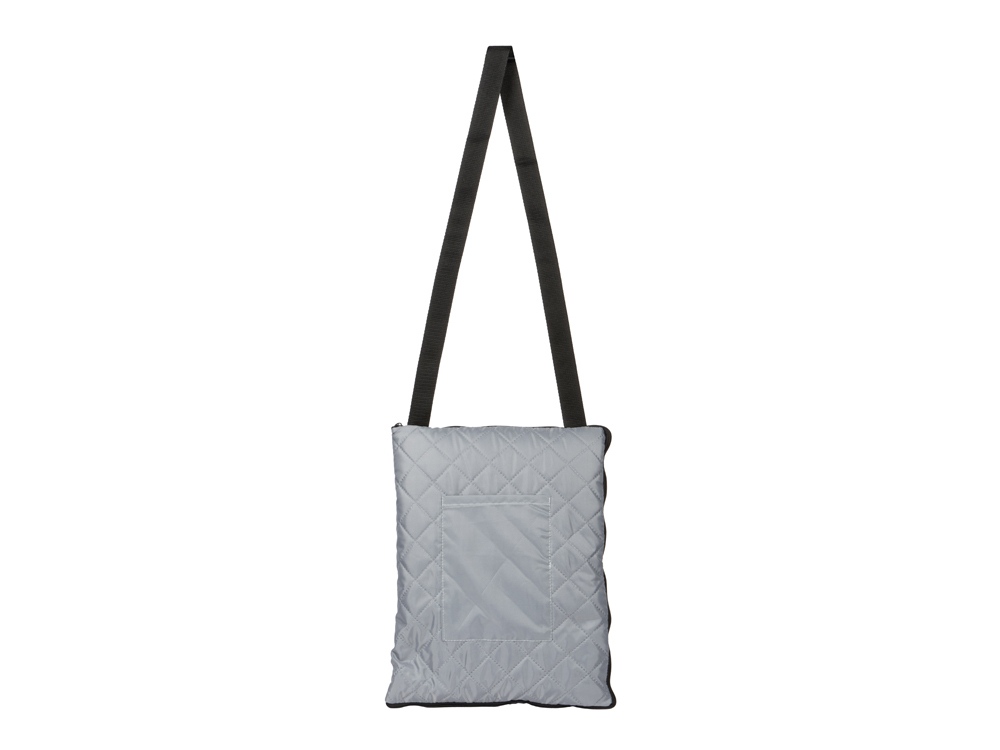 Двухсторонний плед с водоотталкивающим покрытием с одной стороны и мягким флисом с другой. Складывается в сумку на плечо и фиксируется с помощью молнии. В собранном виде имеет регулируемый по длине ремень для переноски и наружный карман для мелочей.