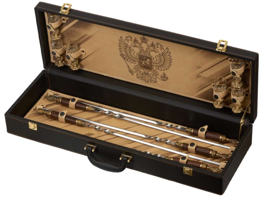 | Материал: | стопки- хрусталь/литье, шампура- нержавеющая столь/дерево, дипломат- сплит кожа |