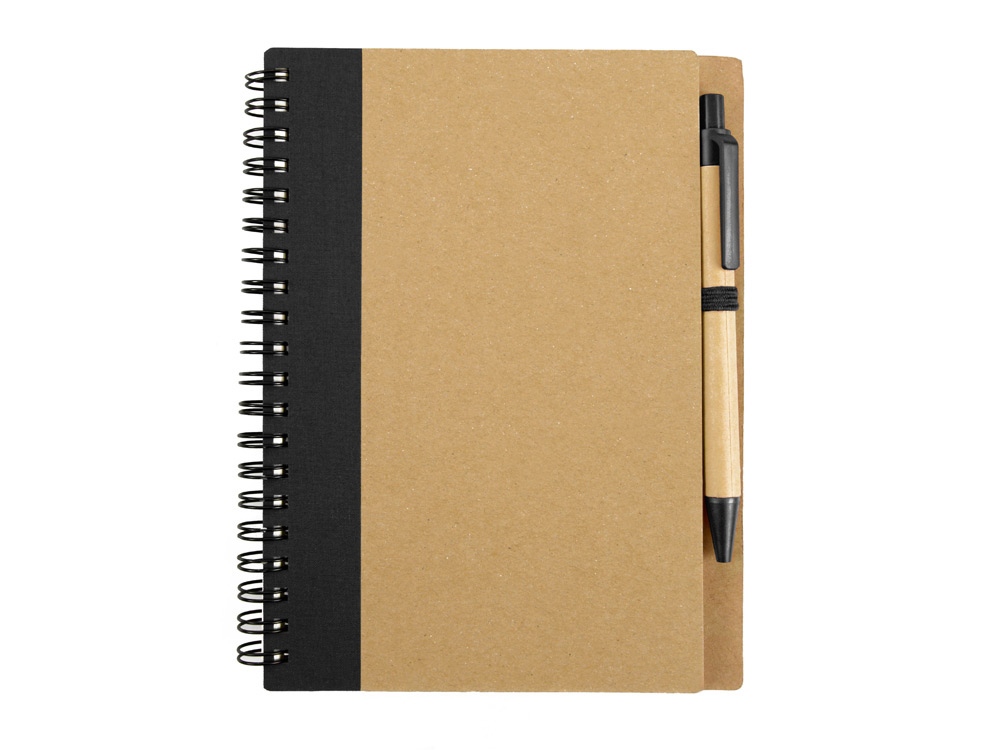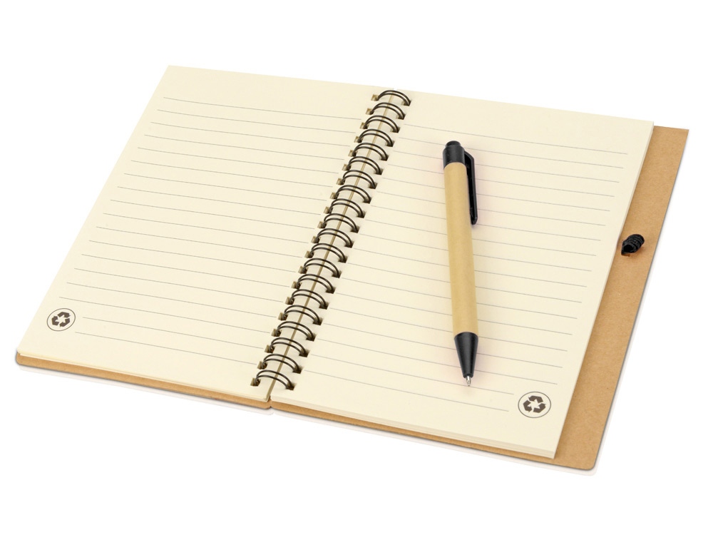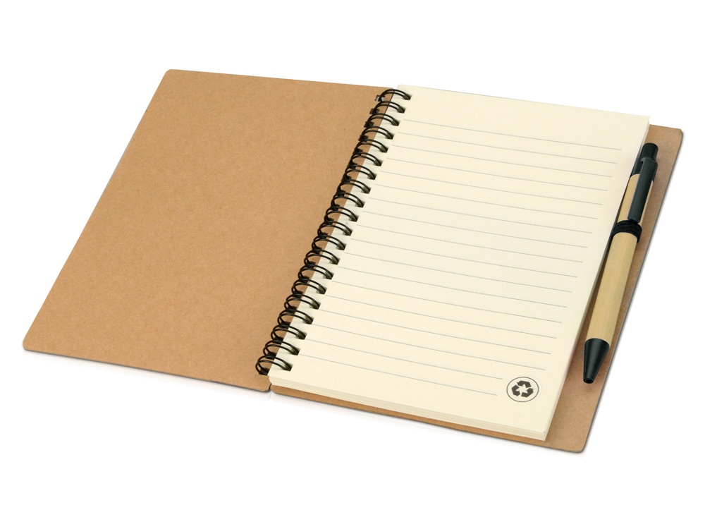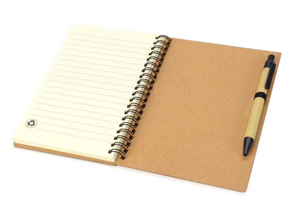 Блокнот с 60 листами переработанной бумаги 70 г/м2 и картонной ручкой в цвет блокнота. Комплектность: блокнот, ручка шариковая d1 х 13 см