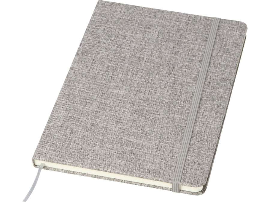 Блокнот формата А5 в твердой обложке из переработанного хлопка, 80 листов бумаги плотностью 70 г/м² в линейку. Блокнот имеет эластичную застежку, ленту и закругленные углы. FSC certified paper. FSC Mix Credit P7. 1 CU-COC-877277.