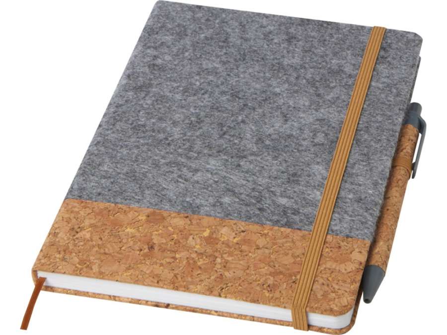 Блокнот формата A5 в твердой обложке изготовлен из пробки и переработанного фетра и состоит из 80 разлинованных листов бумаги плотностью 70 г/м², эластичной застежки, закладки-ленты и петли для ручки. Кнопка, зажим и кончик шариковой ручки изготовлены из переработанного пластика, а корпус — из пробки. Чернила для ручки: черный. Длина непрерывной линии: 600 метров. Размер пера: 1, 0 мм. FSC certified paper, Cork, Фетр. FSC Mix Credit P7. 1 CU-COC-877277.