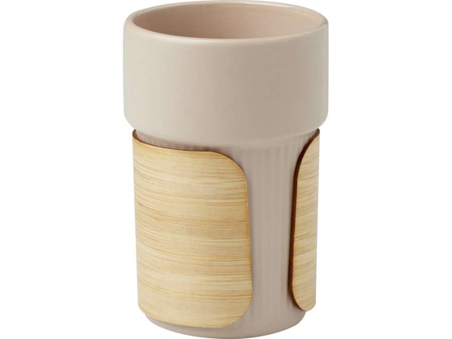Стильный керамический стакан Fika поставляется со съемным бамбуковым чехлом, который идеально подходит для питья горячих напитков. Используемый бамбук поступает из устойчивых, экологически чистых и социально ответственных источников. Объем: 340 мл. Поставляется в коробке из переработанного картона. 94% Stoneware.