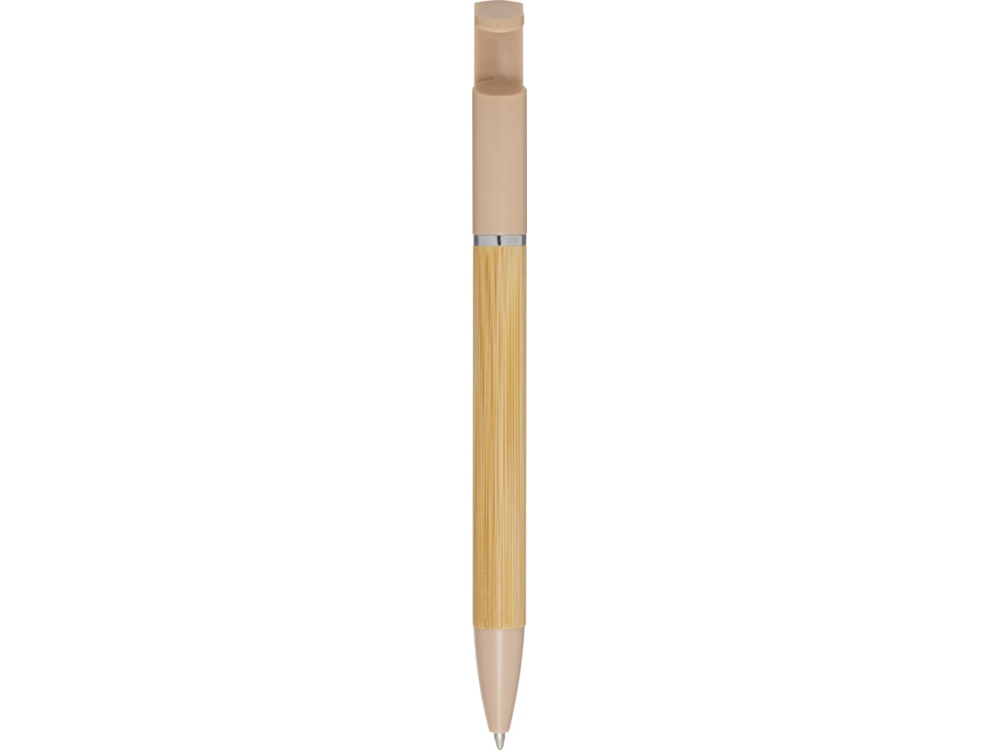 Бамбуковая шариковая ручка, которая также может служить подставкой для телефона. Кнопка и среднее кольцо изготовлены из переработанного пластика, наконечник — из латуни, а корпус — из бамбука, полученного из ответственных источников. Цвет чернил: синий. Длина непрерывной линии: 1000 метров. Размер пера: 1, 0 мм. FSC certified bamboo. FSC Mix Credit N5 CU-COC-877277.