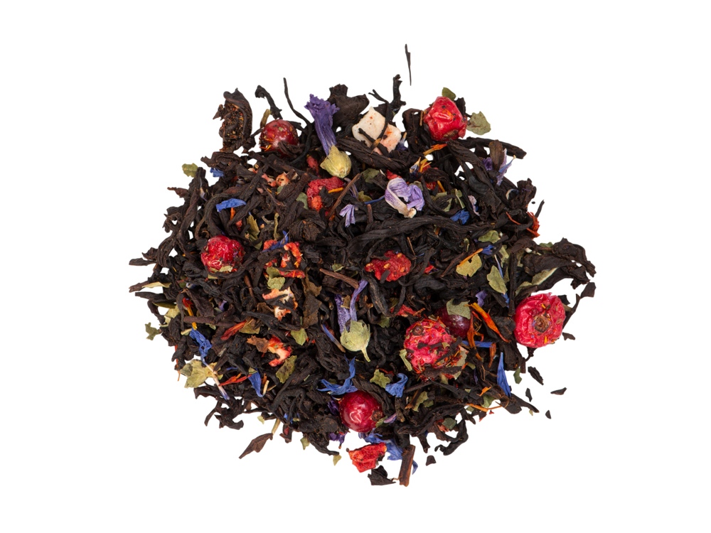 - состав: купаж крупнолистового черного индийского чая, лепестки василька, лепестки сафлора, мальва цветки, листья смородины, ягоды красной смородины сублимированные, кусочки ягод клубники сублимированные, натуральный ароматизатор;