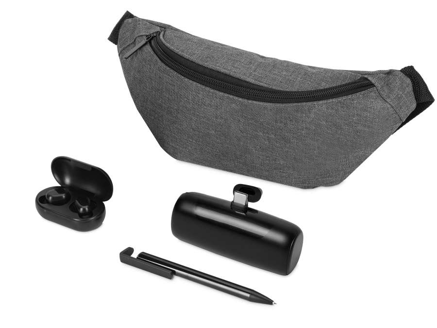 • идеальный набор для поездок и путешествий Комплектность: сумка на пояс, ручка шариковая, беспроводные наушники, повербанк