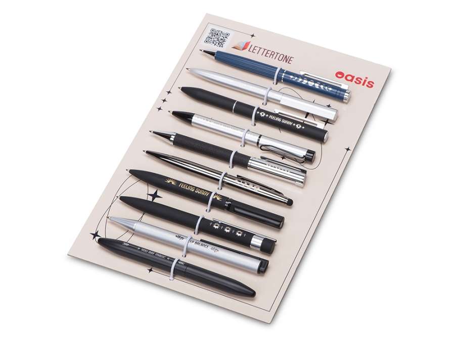 Промо-набор — идеальный инструмент для презентаций: клиенты могут подержать ручки в руках, опробовать их в деле и наглядно увидеть различия между видами нанесения. При этом все самые важные модели собраны в одном легком и компактном наборе.