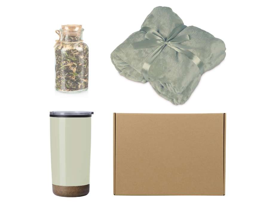 Подарочный набор с пледом, термокружкой и чаем, оливковый