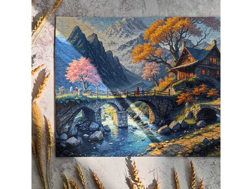 Именно она подсказала нам, каким должен быть рез этого пазла. Горные вершины состоят из деталей с острыми краями. Это напоминание о жизненных вызовах и стремительно меняющихся обстоятельствах. А дом и журчащий перед ним ручей сделаны из деталей с плавными очертаниями. Они говорят о семейном тепле, поддержке близких людей, и уюте.