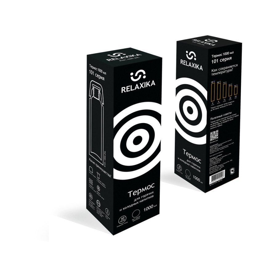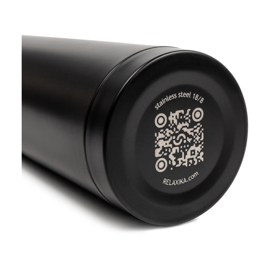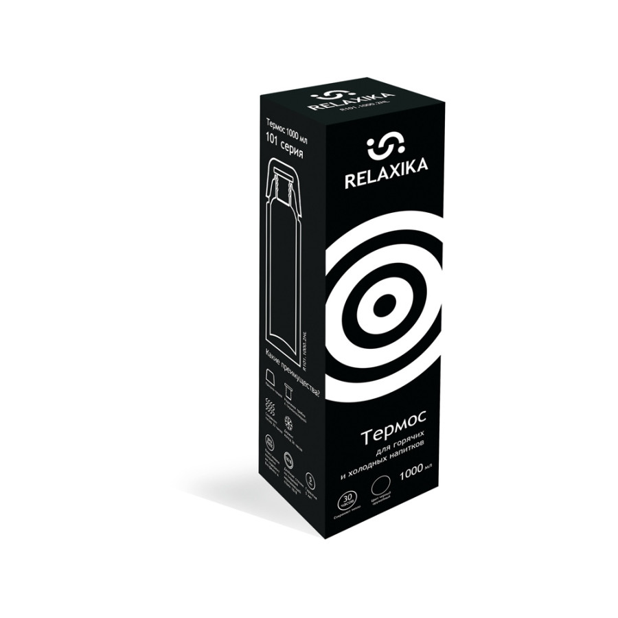 Классический термос Relaxika черного цвета с высокими показателями удержания температуры напитка для походов, путешествий, спорта и ежедневного использования. Прочные двойные стенки из высококачественной нержавеющей стали 18/8 с вакуумной изоляцией гарантируют, что ваш напиток останется холодным в течение 36 часов и горячим до 30 часов. Этот материал не только прочен, но и гигиеничен, не выделяет никаких вредных для здоровья веществ. Ваши напитки сохраняет естественный вкус и не приобретут посторонний запах.